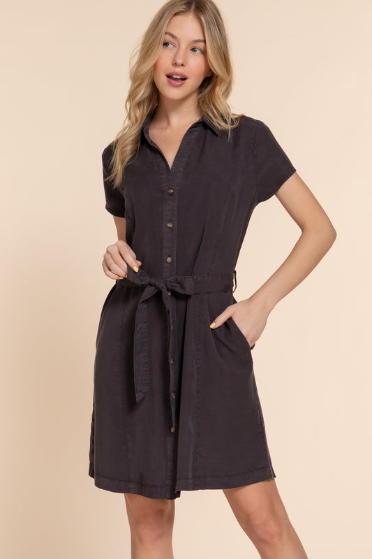 D8084AB SHORT SLV BELTED TENCEL SHIRT MINI DRESS