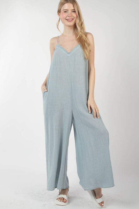 R8072VJ Frayed Hem Detail Solid Gauze Comfy Wide Leg Jumpsuit