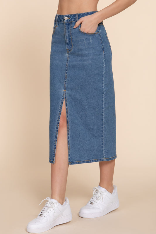 SaleS8007AB MIDDLE SLIT MIDI DENIM SKIRT