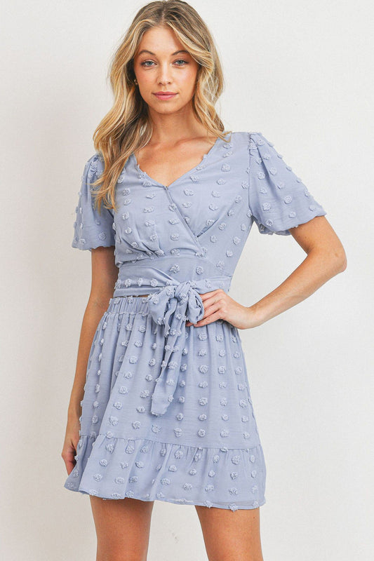 Pompom Textured Surplice With Waist Tie Short Sleeve Top